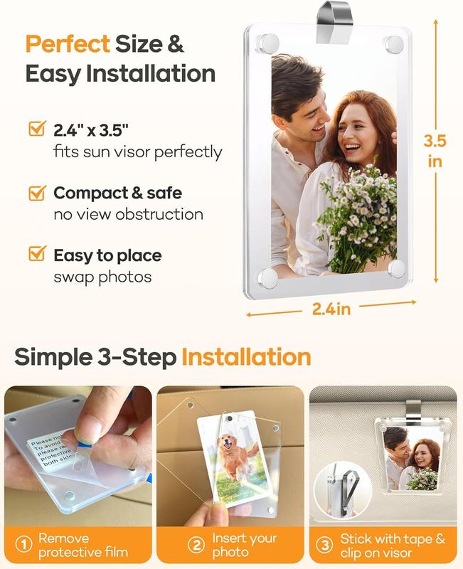 Designed for easy installation and quick photo changes, these acrylic frames snap securely onto any car sun visor with sturdy stainless steel clips. The compact design won’t block your view, keeping your photos visible and your drive safe. Universally compatible with all cars, they add a clean, elegant touch while holding memories or reminders you want close at hand.