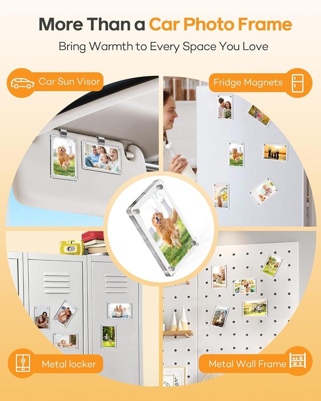 Each frame is crafted from crystal-clear acrylic with smooth, safe edges to protect your photos and fingers. Strong magnets keep photos flat and secure, even on bumpy roads, while rust-resistant stainless steel clips ensure long-lasting durability. A premium finish that blends seamlessly with any car interior.