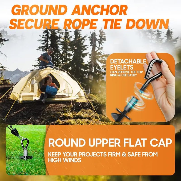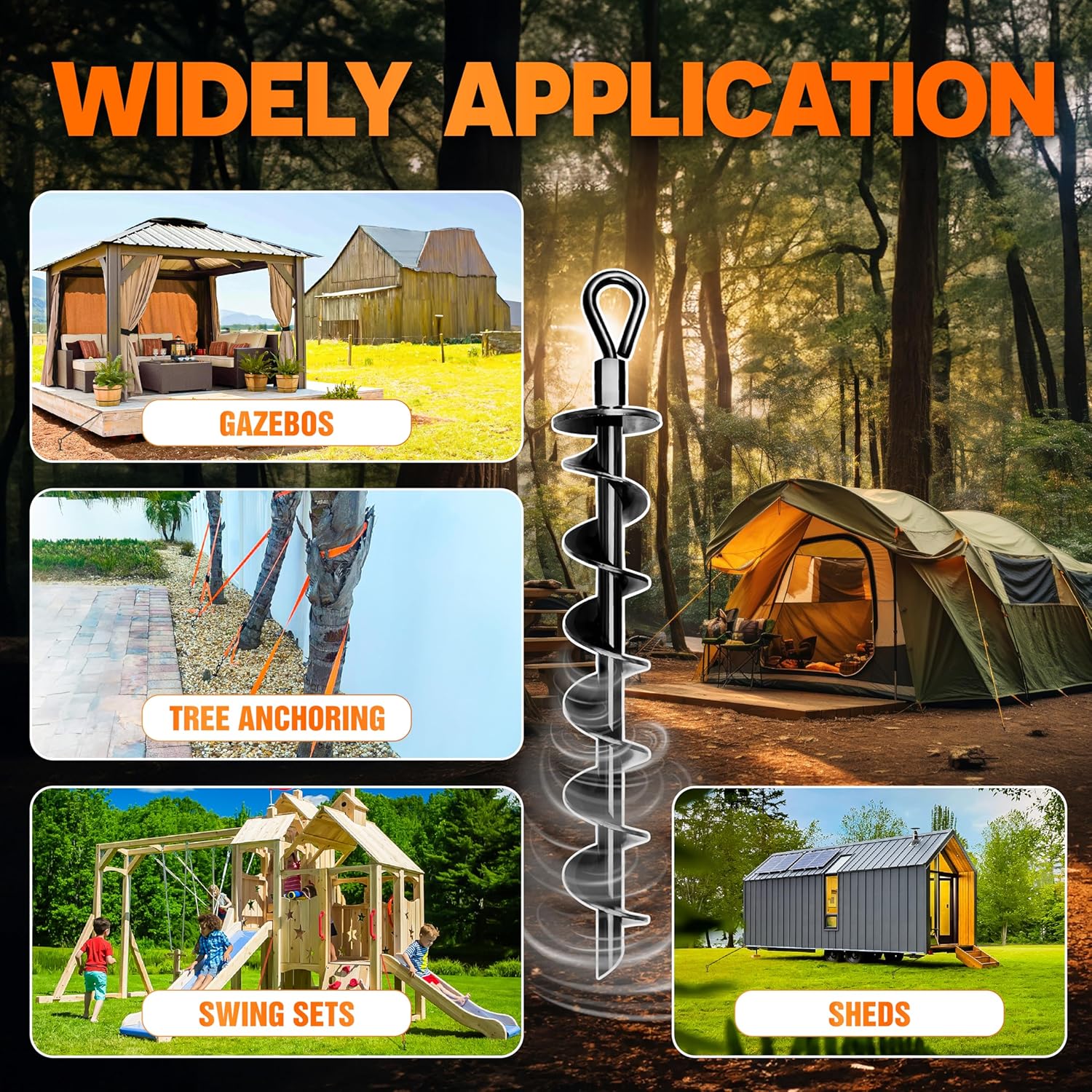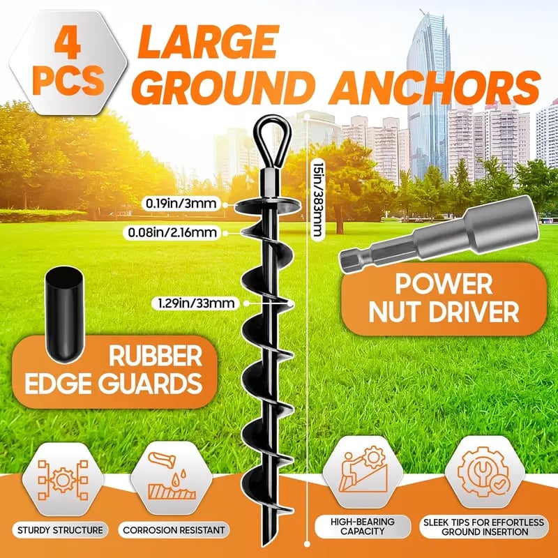 You will get not only 4 ground anchors which are 15 inches long with detachable eyelets, but also a power nut driver for connecting with the drill. Each ground anchor has a cover to protect the sharp tips, providing better safety while moving. Our ideal ground anchor set, swing set anchors, trampoline stakes, tent stakes heavy duty, heavy-duty playset anchors, or anchor shed augers - greatly improve your experiences.