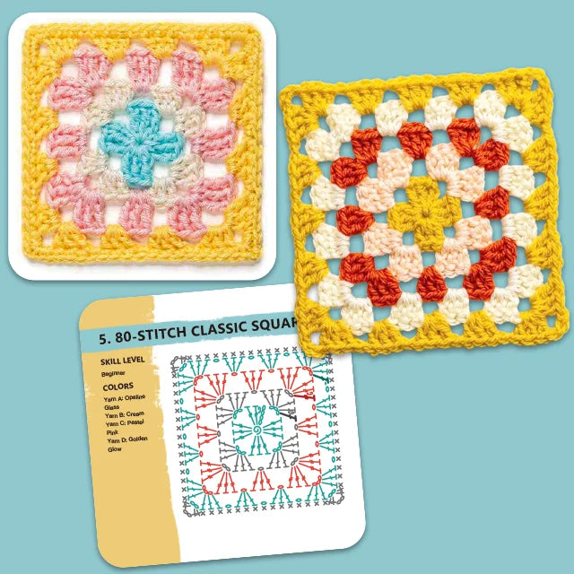 - 50 vibrant 4x4" cards with stunning granny square designs
