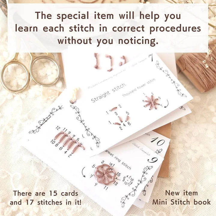 The star of this kit is the reusable embroidery book—a unique, eco-friendly material designed for beginners to practice their stitches again and again. With 17 essential stitches included, you'll have plenty of opportunities to refine your technique until you're stitching like a pro!