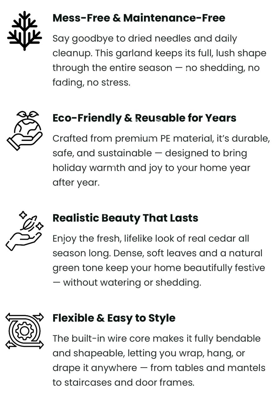 This isn’t your average plastic garland. Each strand is made from eco-friendly PE material, featuring dense, soft cedar leaves that capture the look and feel of fresh greenery — without the mess or maintenance.