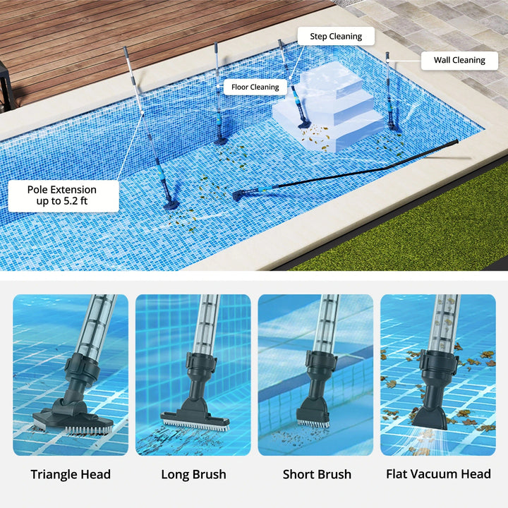 This cordless pool cleaner is designed to simplify pool maintenance by efficiently removing debris from the surface, walls, and floor. Featuring multiple interchangeable heads, a lightweight structure, and cordless operation, it provides a practical solution for keeping your pool clean with minimal effort.