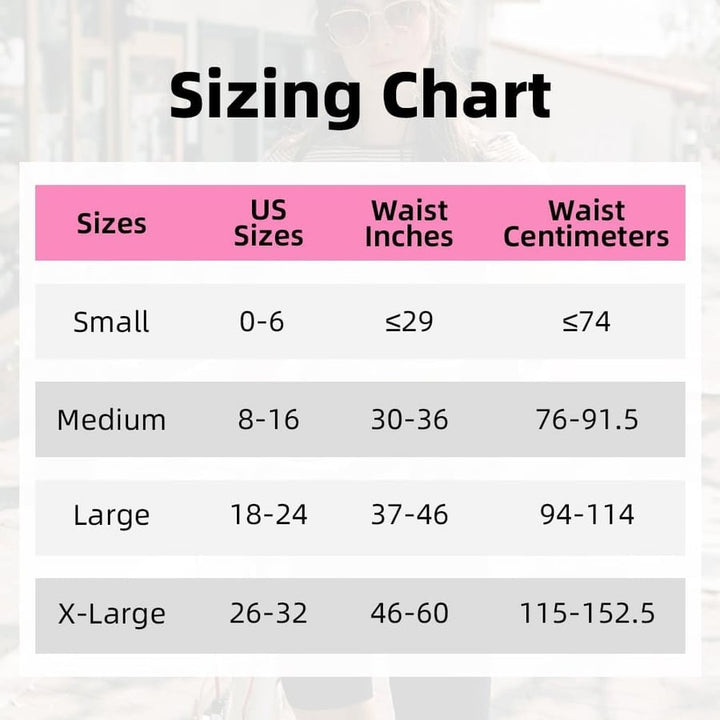It can fit bodies between sizes 0 to 32 with only 4 sizes! Size Small (0 - 6), Size Medium (8 - 16), Size Large (18 - 24), and Size X-Large (26 - 32). Giving you the freedom to choose your best and most comfortable fit.