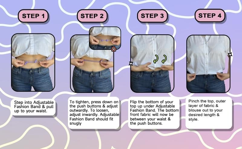 - Tuck our oversized shirts into our pants/waistband: instead of tucking your oversized tops into your pants, just tuck them into an adjustable elastic band, blouse, and you're done. You no longer have to repeat your clothes every time you go to the toilet. And no more bulkiness in the front of your jeans or leggings.