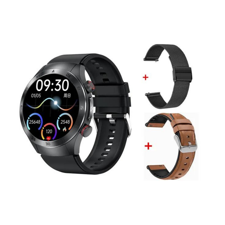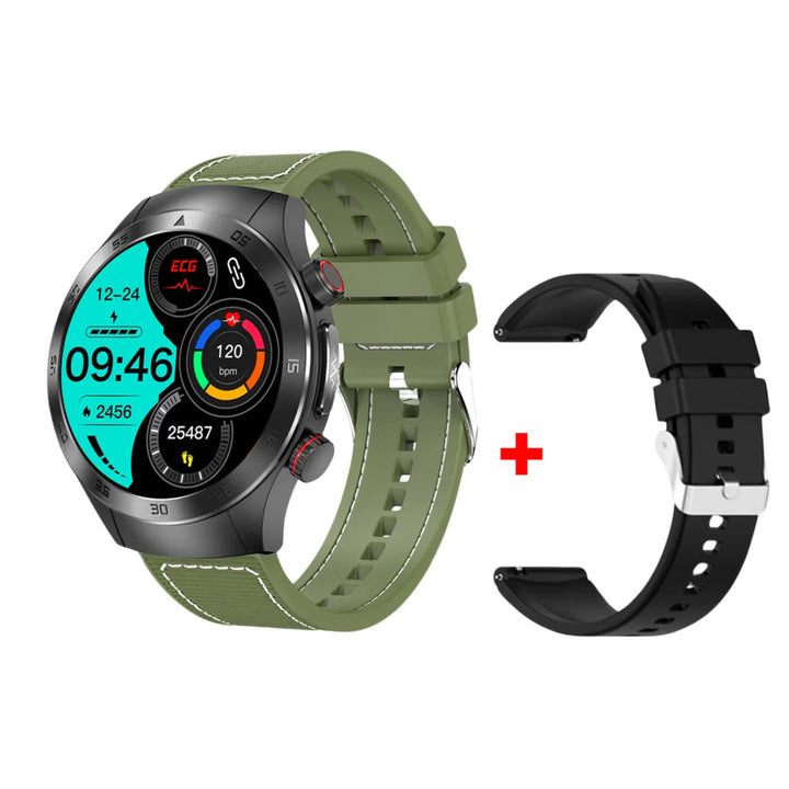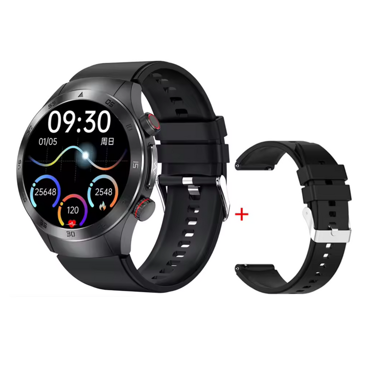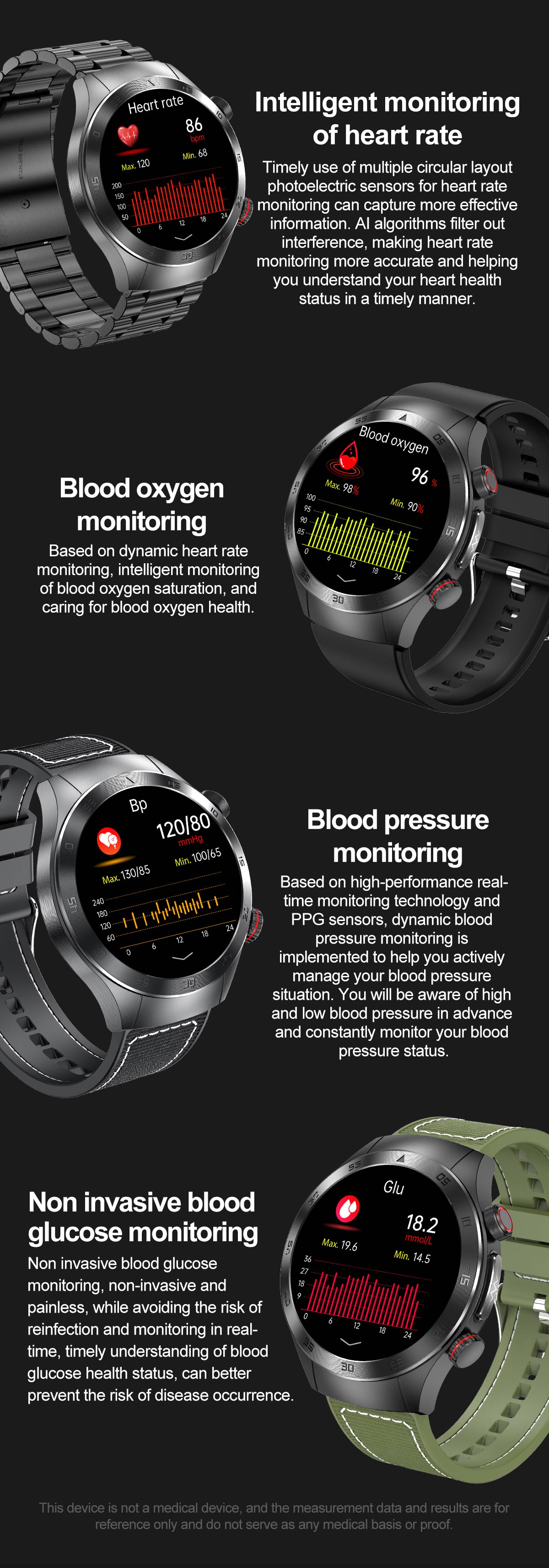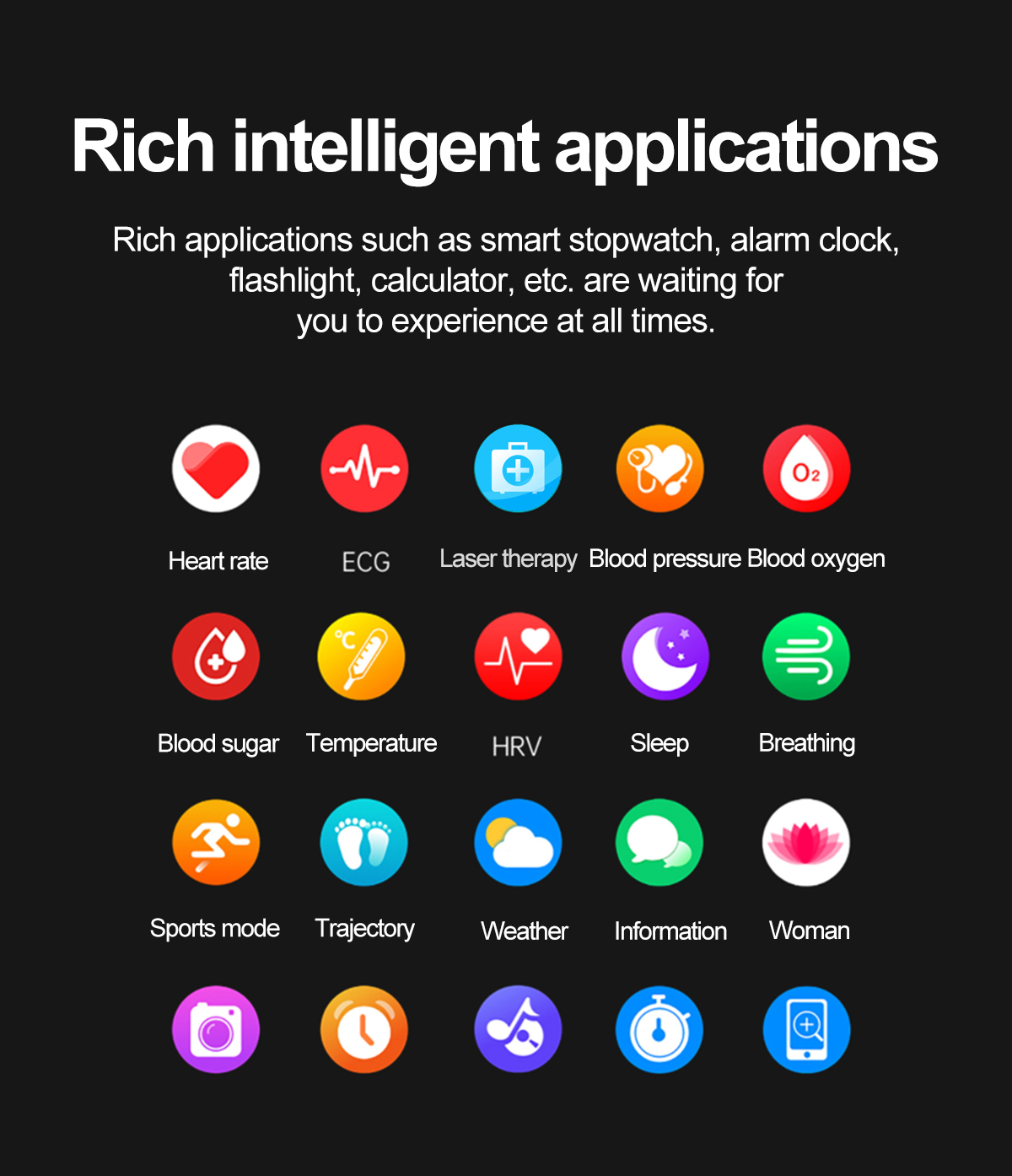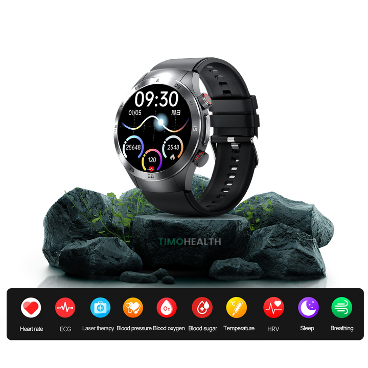 – Monitor ECG, blood pressure, non-invasive blood sugar, uric acid, blood lipids, HRV-AI diagnostics, heart rate, sleep, SpO₂, and temperature – all in one device.