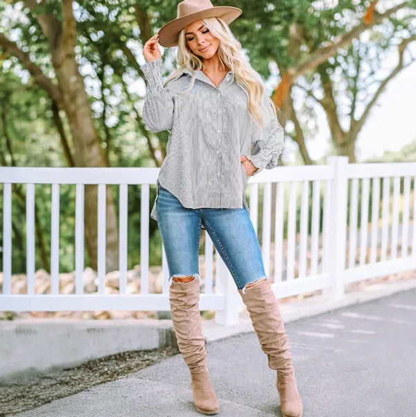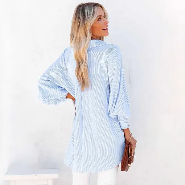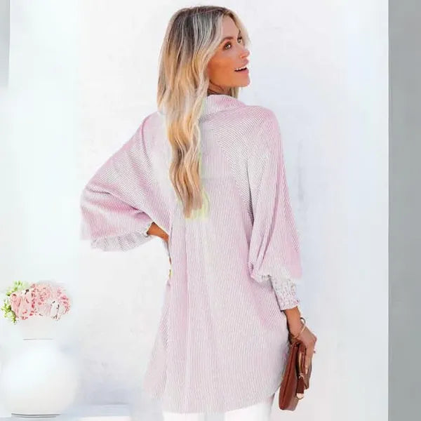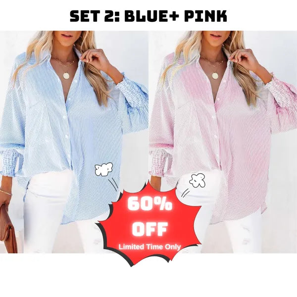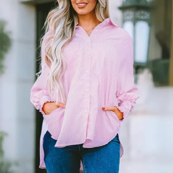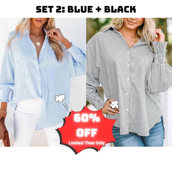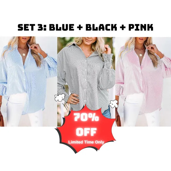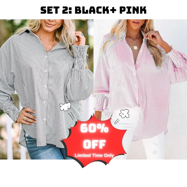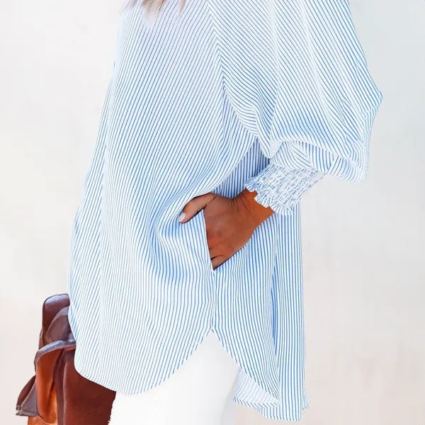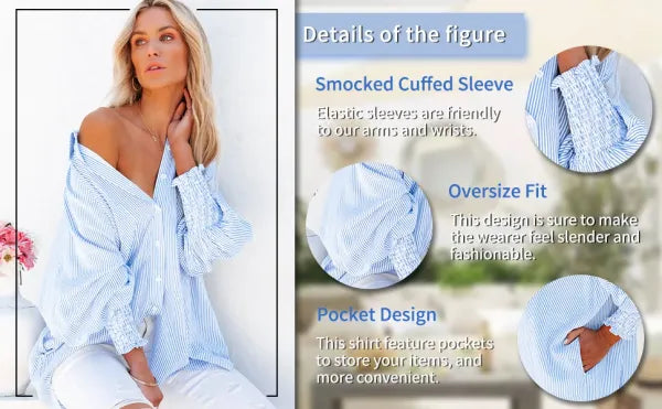 Smocked Cuff Boyfriend Shirt: Casual Striped Shirts for Women with Pocket, Stylish V Neck, Striped Print, Smocked Long Sleeve Shirred Shirt, Summer Tunic Tops for women. Casual and creative design make you look stylish and charming.
