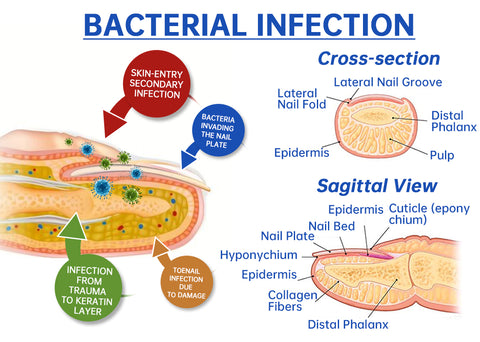 Conditions like paronychia and fungal infections arise when bacteria infiltrate compromised skin near the nail's cuticle and fold, leading to infections.