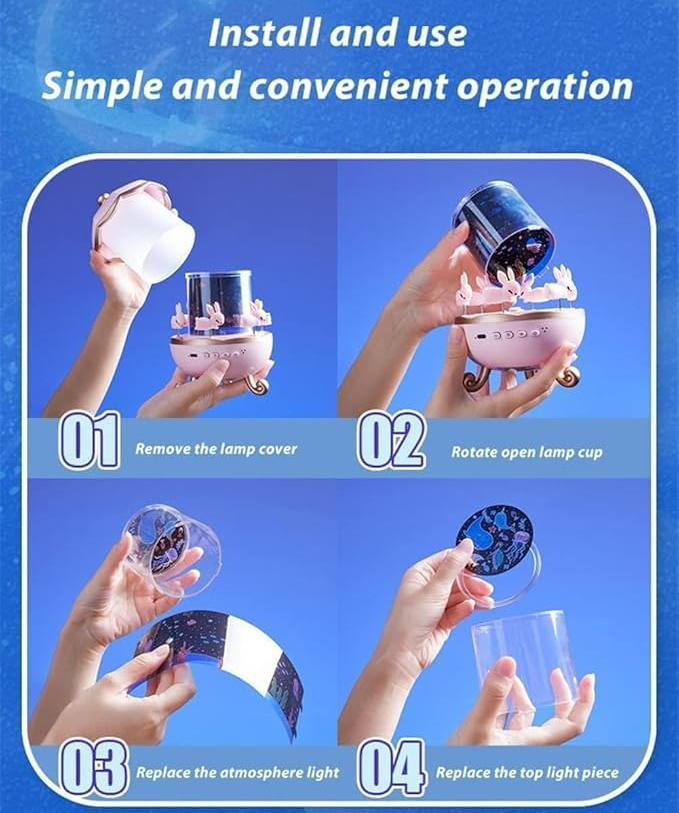 PROJECTION SYSTEM: Six interchangeable themed slides transform walls into magical storytelling environments for children.