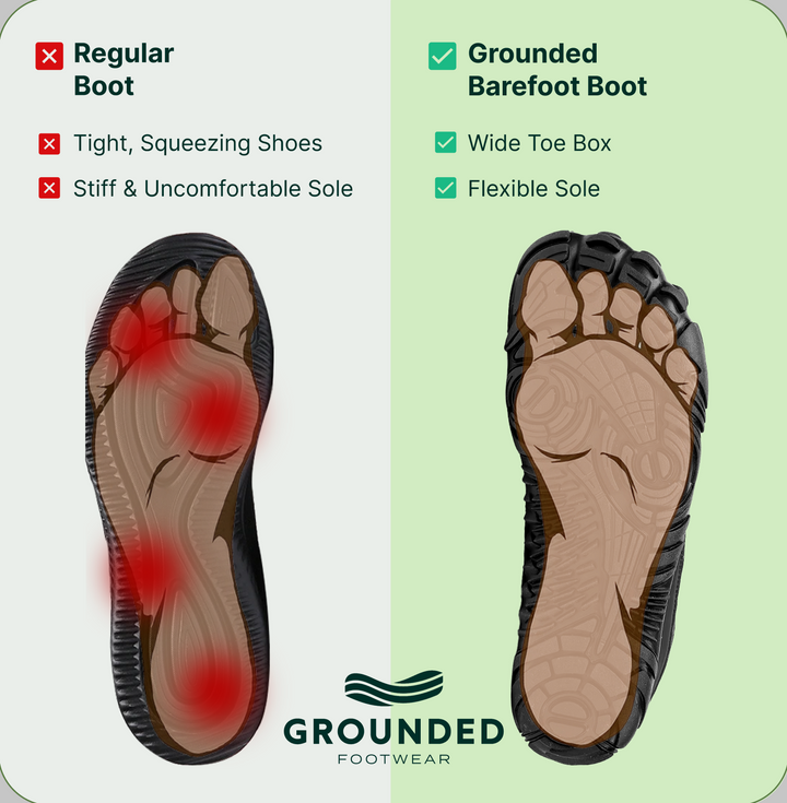 Our Grounded Footwear Limitless Boot strengthens foot and leg muscles, promoting a natural stride that alleviates pain. Ideal for those battling joint pain in feet, knees, hips, and back, as well as plantar fasciitis.