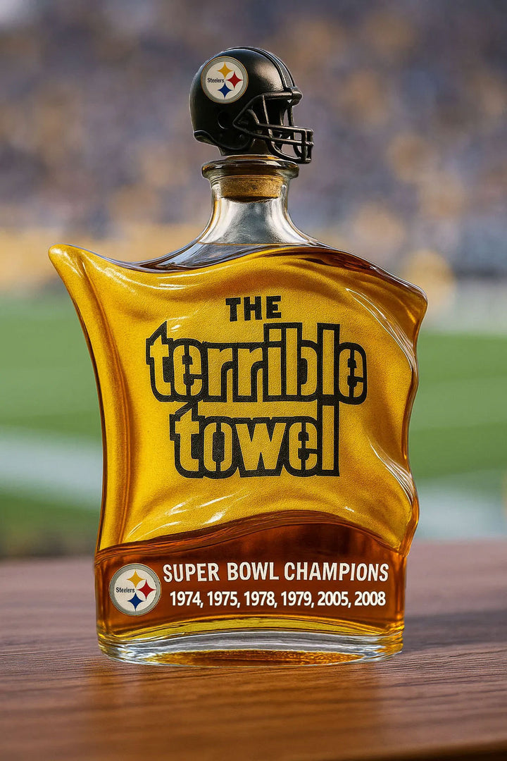 🖤🏈From that first wave in 75 to every freezing playoff since, the Terrible Towels been more than a fan thing itsSteelers soul in fabric form. Now its glass.👇👇🔥 Hand-blown.💀 Tough as Pittsburgh.We curved the bottle like the towels caught in the wind. Slammed the logo right on front. And engraved the words that started it all:19752025, The Terrible Towel is poised to strike!This aint your grandpas decanter. Unless your grandpawas Myron Cope.