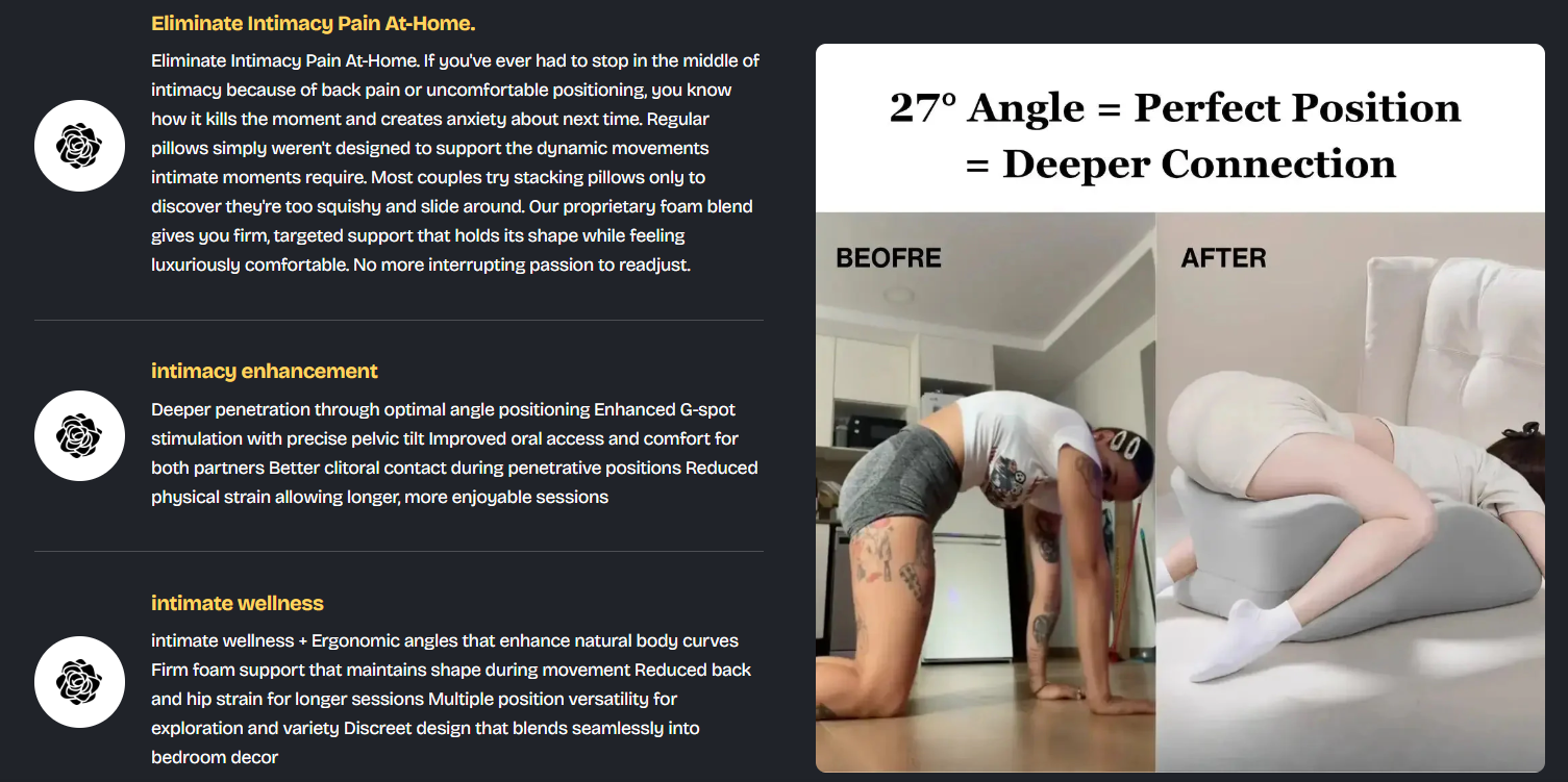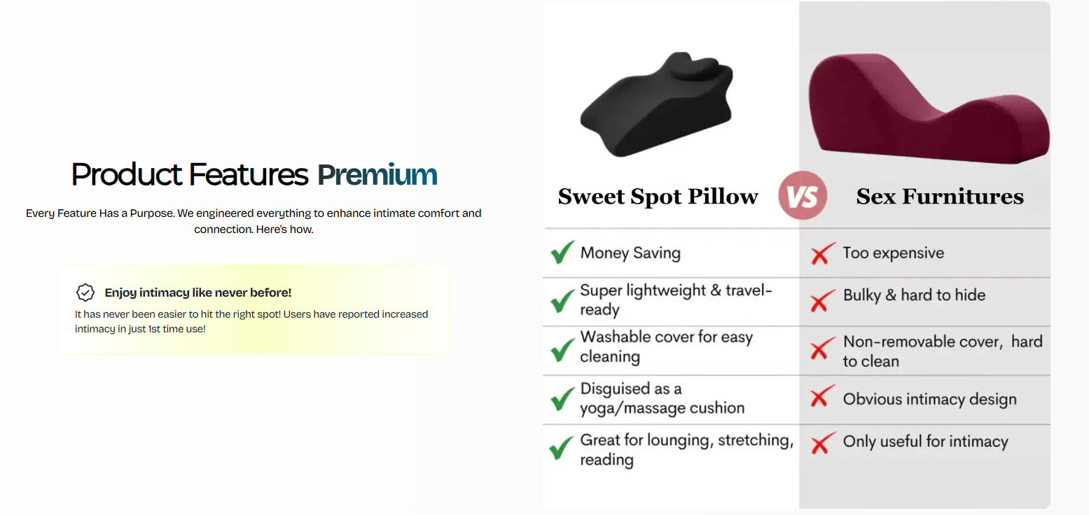 The Sweet Spot Pillow features scientifically-designed ergonomic curves that align your bodies for maximum comfort and intimacy. Unlike regular pillows that flatten and slip, our high-density memory foam maintains perfect positioning while the double concave arc design fits your natural body curves. Thousands of couples have discovered how proper support transforms both comfort and connection.