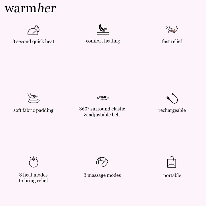 Warmher features state-of-the-art heating technology designed to provide fast and effective relief. It heats up to the perfect temperature within minutes, so you donât have to wait to feel comfortable.